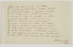 Page d’album, 13 vers extraits du poème Le Retour, épître dédiée à sa sœur la comtesse O’Donnell (1828) :{CR}« Naples, divin séjour, jardin de l’Italie,{CR}Où le palmier grandit sous un constant soleil ;{CR}Où l’orgueil se repose, où la gloire s’oublie ; […]{CR}Où dans l’exil enfin l’on pourrait être heureux ! »…