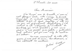 St-Florent 20 mars [1991]. Lors de son récent passage à Paris, il a trouvé son livre Le Grand Verre rêvé : « Sachant combien vous vous êtes intéressé de près, et depuis longtemps, à cette œuvre pour moi profondément énigmatique (c’est surtout le côté échiquéen de l’activité de Duchamp qui m’est familier), je vais avoir plaisir à vous prendre pour guide – particulièrement autorisé puisque vous avez la caution de l’auteur »... St Florent 1er mai. « Sensible toujours à votre démarche poétique, je vous adresse en ce jour non ouvrable mes remerciements pour un envoi original. […] L’œuvre de Duchamp est allée où va toute chose qu’elle soit d’art ou d’anti-art. Nul n’y peut rien, mais son esprit s’en détache : il reste, comme vous faites, à le préserver »... 8 décembre : « J’ai lu avec intérêt le texte que vous me faites parvenir, et que vous voulez bien me consacrer. Que vous en dire ? Je ne sais si mes livres méritent ce commentaire lyrique et trop élogieux. Mais je suis sensible à sa chaleur et à sa sincérité »...