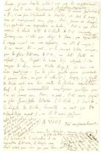 Curieuse lettre aux mystérieux sous-entendus. « Pendant que vous composez des hymnes à la violette, notre ami le Major fait de l’épopée. Il est venu me voir hier pour m’inviter à modérer votre intérêt, je ne dis pas sur “Les badinages” du Chevalier, qui sont déjà en bonne main, mais sur cette “Robe de tulle” (presque La robe de laine de M. Henry Bordeaux) à laquelle essaie de vous intéresser un amateur qui, de votre propre aveu, vous ne connaissiez pas il y a un mois. Conservons nos luminaires pour les œuvres de la maison ; elle en est, certes, assez riche. Oui, depuis hier, le major est en pleine épopée. Vous connaissez déjà, à ce qu’il m’a dit, les chants antérieurs de son Iliade, consacrés jusqu’ici aux gloires de la religion (St Lazare), de l’histoire de France (le maréchal de Luxembourg) et du Massif Central. Hier, jour qui jusqu’à présent n’avait pas figuré parmi ses jours inspirateurs, il s’est trouvé tout à coup inspiré. Naturellement, il n’était pas chez lui, où toute Muse est introuvable, mais dans le voisinage, dont le nom rappelle ces “Soirées” dont vous fîtes le charme, en pays du “compliment d’usage”. Il régnait en maître et seigneur, vous le savez, sur ce pays-là ; les Muses lui souriaient. […] Le chant nème de l’Iliade de l’O. commence. […] Il va savoir, dès ce soir, si la journée d’hier marque, pour la gloire littéraire de l’O., une date faste ou néfaste ! Car, d’après les rimes déjà alignées (il compose de chic, comme Victor Hugo), ce sera une chose prodigieuse. Que les plus grandes œuvres paraissent de pauvres choses, au prix de celle-là ! Songez-y : toutes les Muses sont avec lui, contre la fâcheuse inspiratrice du dehors. Bref, le plus invraisemblable amphigouri poétique que l’on ait jamais vu. Oui, ce soir, l’O. aura gagné sa plus formidable bataille (L’Iliade, L’Énéide, La Légende des Siècles, Corneille ne sont que des enfantillages auprès), ou il l’aura perdue »...
