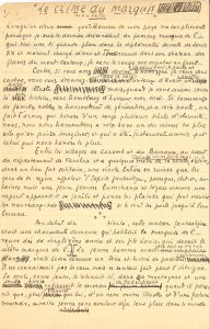 Nouvelle complète. Il s’agit de la confession du dernier descendant du fameux marquis de C..., « qui tint une si grande place dans la diplomatie secrète de Louis XV et mourut chargé d’ans et d’honneurs dans son château des flancs du Mont-Ventoux ». En effet, la fortune du marquis était fondée sur « un des crimes les plus vils qu’on puisse imaginer », ourdi avec un Florentin diabolique... Le manuscrit, à l’encre noire sur papier ligné, présente de nombreuses ratures et corrections ; au dos de cinq feuillets, on relève des ébauches et brouillons biffés.