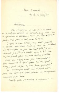 Il sera de retour à Paris en avril et espère s’entretenir avec lui. « Voudriez-vous en attendant, me renseigner un peu sur vos projets ? Je vous indique que j’ai des traités avec N.R.F. pour la plus grande partie de mon œuvre publiée. Mais que voyez-vous que nous puissions faire ensemble ? Quel genre de livre – quel tirage – quel degré de luxe, dans quels prix ? Ces renseignements me seraient utiles pour mes réflexions, pour orienter un arrangement éventuel entre nous »...