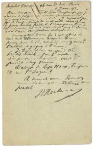 Il est à Broussais « pour peu de temps. Malade... et autre chose. Mais je pense bientôt partir à l’étranger en tournée de conférences. Ça m’a déjà réussi en 9bre dernier à La Haye, Amsterdam et Leyde. Envoyez moi donc les 3 exemplaires où sont mes Souvenirs Messins. [...] Je travaille en masse ». Il annonce des réimpressions et inédits chez Vanier, et demande confirmation de l’adresse de Roger Marx...
