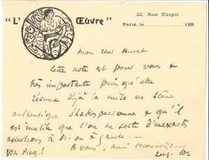 Bel ensemble du directeur du théâtre de L’Œuvre au critique du Figaro. « Merci de tout, critiques, éloges, de tout enfin » (30 décembre 1892)... « Encore n’est-il pas impossible que L’Ennemi du Peuple vaille Petit chagrin » ([vers 1893])... « Il n’y a pas “collusion” entre Duse & moi. – Je lui ai écrit à votre sujet une ligne […] Aujourd’hui je reçois 4 pages délicieuses à votre endroit »... Il peut lui adresser des candidats au Conservatoire, bien qu’il déteste enseigner : « Ne livrez rien de ce mot à la publicité, mais en attendant le fantoche comique qui doit révéler un autre Lugné à mes contemporains je dois vivre & c’est parfois tragique si je parviens encore à garder le sourire sur mes lèvres moroses »... « Je mets un mot à Maeterlinck. – Faites-moi l’amitié donc de lui mettre vous-même un mot par ce courrier pour lui dire que depuis 1 mois vous êtes au courant de mes projets qui sont en somme honorables & intéressants pour lui »... « Depuis six ans que “L’Œuvre” tourne sur elle-même partie de Pelléas brulant Ibsen, j’ai cherché la pièce. La Pièce bien française latine, gaie & dramatique, résumant ou indiquant une formule d’art supérieur. – Je crois, je suis presque sûr de la tenir aujourd’hui » (Bruxelles [1893])... « Je prendrai sans doute le Nau Théâtre pour un délai assez long. – Donc voyez si avec d’Annunzio (Gioconda) Ibsen (Maison) je pourrais avoir le retour de la grande pièce de l’homme en question »... « C’est fait ! J’ai le Nouveau Théâtre en janvier pendant 1 mois »... « Les rapprochements, ou plutôt les oppositions “légendaire” et “contemporaine” sont paraît-il très précieuses, à l’esprit de Bataille »... Envoi de notes, dont une sur une « mise en scène authentique shakespearienne », et prière d’insérer : « Connaissez-vous le Dialogue à la maréchale de Diderot. C’est épatant d’actualité... mais n’en dites rien »... « Votre article est une merveille d’ironie »... « J’ai lu votre manuscrit. J’ai sur lui les mêmes sentiments que les deux personnes à qui vous l’aviez confié. Mais les objections qu’ils vous firent, je me les fais aussi à moi-même ! » (5 avril 1907)... Demande confidentielle d’un coup de main, pour trouver une place avec moins de responsabilités : « je me suis fait si vieux à “l’Œuvre” [...]. Enfin il y a sur les 66 pièces que je montai à “L’Œuvre” trois ou quatre pièces qui peuvent faire de bonnes recettes dans un théâtre, maintenant, car le blé semé autrefois est mûr »... On joint un télégramme au même, et une l. à lui adressée de Suède (1894).