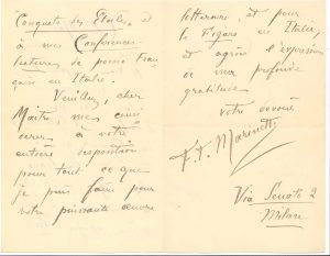 « Je reçois aujourd’hui, avec un énorme retard, les numéros (12 août et 2 septembre) du Figaro qui contiennent les beaux éloges que Mr Glaser a consacré à mon poème épique La Conquête des Étoiles et à mes Conférences-lectures de poésie française en Italie. Veuillez, cher Maître, me considérer à votre entière disposition pour tout ce que je puis faire pour votre puissante œuvre littéraire, et pour le Figaro en Italie »...