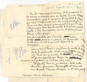 Réflexions sur « la direction générale » de la France et son enseignement. En trente ans de république, la France a organisé son armée excellemment, établi la libre-pensée avec moins de succès, amélioré la condition ouvrière sans assurer le bonheur, et fait un gros effort en faveur de l’instruction publique. « Ici les résultats sont palpables et, il faut le dire : ils sont déplorables »... La science ne satisfera jamais l’âme éprise d’idéal, et l’école, dispensant une éducation « d’essence héroïque », a fait des aigris inadaptés à leurs métiers. Raffaëlli fait valoir les effets révolutionnaires de la locomotion et des moyens de communication : plus de nations « vraiment étrangères », plus de sauvages, et un champ d’action dépassant largement les frontières de la nation. Cependant on continue de bourrer de connaissances inutiles nos enfants « gâtés parce qu’uniques » : alors que depuis un demi-siècle les nations rivales maîtrisent les mers, cultivent leurs colonies, font fructifier le commerce, « nous faisions des bacheliers » ! Pour lui, ces questions de santé morale priment sur les questions d’art... Il évoque le Wagnérisme, l’Ibsénisme et le préraphaélisme, mais rejette la préoccupation française avec les écoles d’art, dont il affirme « le néant » par cette maxime finale : « l’artiste doit passer sa vie à chercher des formules d’art pour mieux définir sa pensée, maintenant, ces formules, lorsqu’il les a trouvées, elles ne valent plus rien ! »{CR}On joint un ensemble de L.A.S. de peintres et sculpteurs adressées à Jules Huret par Albert Besnard (2), Jean Boucher (4), Alfred Roll (2, plus 2 d’Huret à Roll) et Sem (sur carte de visite).