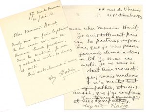 77 rue de Varenne 5 décembre. « Voulez-vous me faire le plaisir de me venir voir rue de Varenne, lundi prochain, dans la matinée. Je vous y attendrai »... 11 décembre. « Je suis tellement pris par la poitrine aujourd’hui, que je vais passer la journée demain dans mon lit. Je serai ici samedi »... Meudon 12 décembre. « Je continue d’être un peu malade, et à mon grand désespoir je devrai manquer aux engagements que j’avais pris avec vous et avec madame Huret. [...] vous allez avoir de mes nouvelles. Je sis à Meudon, et je n’oublie pas le torse »... Paris 16 décembre. Il sera très heureux de le recevoir jeudi matin, rue de l’Université. « Et après notre entrevue, vous me feriez plaisir d’accepter ainsi que Madame Huret à déjeuner chez Le Doyen »...