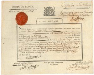Bruxelles 16 mai 1792. Louis-Alexandre-Céleste d’Aumont, duc de Villequier certifie au nom des Commissaires de la Noblesse françoise que M. Duchalin Despalets, volontaire dans la compagnie d’Auxerrois, « est digne de l’asile que LL. AA. RR. ont la bonté d’accorder aux François fidels à Dieu & à leur Roi »... 26 octobre 1796. Fortuné Guyon, comte de Rochecot, maréchal des camps et armées du Roi, remet la croix de Saint-Louis au nom de Sa Majesté, pour services « pour le retablissement de l’autel et du throne »... Windisch Landsberg 1er mai 1801. De Rison, général major commandant du corps de l’artillerie du Corps de Condé, régiment de Denis, approuve le certificat de congé absolu donné à J.-B. Barbier, premier canonnier de la compagnie de Mercey, lors du licenciement du Corps de Son Altesse...{CR}On joint un certificat de congé pour blessures, signé par le général de Tourville, Maubeuge 8 avril 1793, deux mois avant d’être suspendu de ses fonctions.