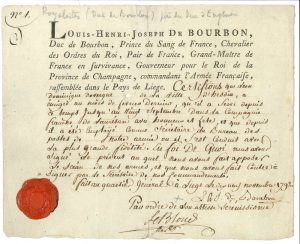 Louis-Henri-Joseph de BOURBON, Prince de CONDÉ (1756-1830) lieutenant-général, il se battit dans l’émigration ; père du Duc d’Enghien. P.S., Q.G. à Liège 19 novembre 1792 ; contresignée par son secrétaire des commandements Le Blond ;...