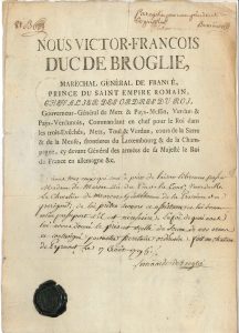 Victor-François, Duc de BROGLIE. 2 P.S., 1794-1795 ; la seconde contresignée par son secrétaire Nicolle ; 1 page in-fol. chaque en partie impr. à son en-tête, sceau de cire noire à ses armes sur la 2e.