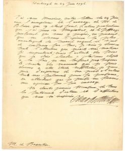 Il a reçu sa lettre avec l’ouvrage de M. de Blaire. « L’estime particuliere que j’ai pour ce magistrat, et le suffrage personnel que vous y joignés, ne peuvent que me donner l’opinion la plus avantageuse du travail auquel il vient de consacrer son tems. Je vais y donner toute l’attention que merite une matiere si importante »... Il le prie d’en remercier l’auteur de son ouvrage, « l’activité des soins que je dois etendre a plusieurs objets a la fois, ne me laissant pas toujours le maître des moments que je puis donner a cette étude refflechie »...