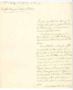 Kupffenberg près Bruk 31 décembre 1800, à l’évêque de Nancy [Mgr de La Fare, émigré à Vienne]. Il le prie de faire passer une lettre à Pétersbourg, et l’invite à lui écrire « franchement », par le retour du comte Alexandre de Damas, « ce qu’il pense sur tout ceci, tant pour le present, que pour le futur ; quels evenements ! et qu’on paye cher, l’aveuglement de l’egoïsme et de l’ambition ! Le Nord, et l’Intérieur ont toujours été, et seront toujours notre seule ressource ; ne desesperons pas »...{CR}Q.G. de Feistritz 10 février 1801. Certificat de service militaire : François Jean du Buat, de la Province de Normandie, a commencé à servir dans la coalition de sa province le 1er août 1791, et « doit être reconnu Sous-lieutenant à la suite de l’infanterie »...
