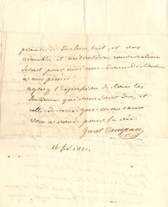 Lettres désespérées après le décès de son fils unique, Henri Campan, survenu en janvier.{CR}15 février. « Il faudroit ne pas vous avoir vu et vous voir encore soigner le malheur avec la sensibilité la plus vaste et la plus touchante, pour ne pas croire à la part que vous prenez à mes affreux malheurs. Une femme âgée, une tendre mère, qui perd son fils unique a toujours été rangée parmi les êtres les plus infortunés. Et c’étoit là le sort que le Ciel me réservoit ! Après tant d’autres épreuves ! Cher enfant ! Une autre santé, et l’on auroit su comme sa mère le savoit ce qu’il y avoit de noble, de sincère, de généreux dans les qualités de son âme, ce qu’il y avoit de lumineux et d’acquis dans son esprit. Mais mon imprévoyante tendresse l’avoit fort jeune lancé sur la terre des illusions, pauvre enfant il en avoit été ébloui […] Les revers, les infortunes lui avoient tout dévoilé sur le monde, et ses qualités s’en étoient accrues – il ne vouloit plus me quitter – c’était une corde que j’avais montée à mon unisson – je la chercherai – je la chercherai vainement le reste de mes jours ». Elle évoque sa nièce Antoinette [Auguié, qu’elle avait recueillie après le décès de sa mère, et qui épousera Laville en 1823], qu’elle ne veut pas voir souffrir : « je n’ai plus que la force de souffrir moi-même »... 13 avril. Elle est sensible à ses preuves d’amitié pour « une famille qui éprouve tous les coups du sort », et prie le général de venir à Mantes « pour le moment où ma chère Antoinette se séparera de Charles. Que pourrois-je lui dire pour fortifier son âme ? Moi qui suis séparée pour toujours de mon cher Henri. [...] Que de choses sont incertaines ! Et combien celles qui nous sont désignées par la tendresse et la raison sont plus supportables que celles qui ne trouvent d’appui que dans une résignation forcée »...