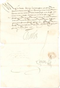 CHARLES IX. L.S., Argentan 14 juin 1570, à Corberan de Cardillac, Sieur de Sarlabos, capitaine et « Gouverneur de ma ville francoise du Havre de Grace » ; contresignée par le secrétaire d’État Simon Fizes ; 1 page in-fol., adresse avec...