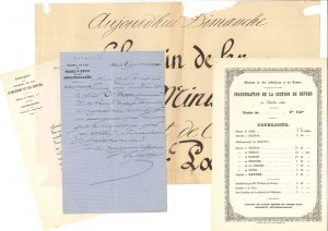 L.A.S. de Prosper Enfantin à en-tête Chemins de fer de Paris à Lyon et à la Méditerranée. Affiche d’horaires d’été des Chemins de fer de l’Ouest. Affichette manuscrite pour un train de minuit de Clamart à Paris. Dossier de candidature pour un emploi dans les Chemins de fer du Midi. Circulaires et correspondance administrative. Factures et récépissés de transport de marchandises. Tirés à part et coupures de presse…