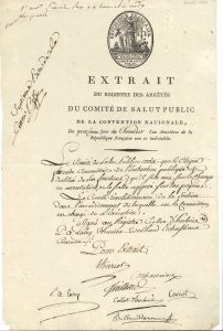 « Le Comité de Salut Public arrête que le Citoyen Fourcade commissaire de l’Instruction publique est destitué de ses fonctions ; qu’il sera mis sur le champ en arrestation, et le scellé apposé sur ses papiers »... Ont signé : Jacques-Alexis Thuriot, Joseph Eschassériaux, Jean-Baptiste Treilhard, Pierre-Antoine Laloy, Lazare Carnot, Jean-Marie Collot d’Herbois et Jacques-Nicolas Billaud-Varenne.