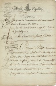 Rapport de la Commission du mouvement des Armées de Terre. Claude-Louis Petiet (futur ministre de la guerre), commissaire ordonnateur en chef de l’armée des Côtes de Brest, « a fait passer à la Commission la copie d’un arrêté du Représentant du Peuple Mathieu qui, sous l’exposé du Conseil d’Administration du 10e Bataillon du Var qu’il a perdu à la malheureuse journée de la Rouillière [il avait été attaqué par l’armée de Charrette le 8 septembre 1794 et la moitié de ses hommes avaient été tués] presque tout son corps de musique et les instruments, a autorisé ce bataillon à en acheter d’autres », mais le prix se monte à 33.500 livres, somme que Pille juge « exhorbitante », d’autant qu’« aux termes de la loy un bataillon de volontaires n’a pas le droit d’avoir une musique particulière »… Le Comité de Salut Public statue : « attendu que l’objet est rempli, cette dépense demeure approuvée » ; cette apostille est signée par Théophile Berlier, François-Antoine de Boissy d’Anglas, Joseph Eschassériaux, Denis Toussaint Lesage et Jean-François Reubell.