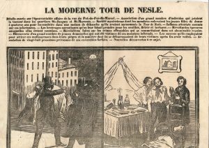 CRIME. AFFICHE, La Moderne Tour de Nesle, Paris impr. de P. Baudouin, se vend chez Dupont, [1844] ; 54 x 43 cm avec grande gravure sur bois.