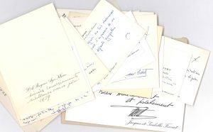 ... Vœux, condoléances, félicitations. On relève les noms de l’amiral d’Argenlieu, Vincent Auriol, Benn, Jean Borotra, général Catroux, Daniel-Rops, Robert Debré, Maurice Druon, Diana Duff-Cooper, Pierre Dux, Philippe Erlanger, Maurice Escande, Jacques Fauvet, Hubert de Givenchy, Olivier Guichard, Georges Izard, Claude Lévi-Strauss, Serge Lifar, Général Massu, André Maurois, Gaston Monnerville, Marie-Laure de Noailles, Jean d’Ormesson, Maurice Papon, comte et comtesse de Paris, Charles Pasqua, Georges Pompidou, Elvire Popesco, Elie de Rothschild, Jean Sennep, Survage, Etienne Wolff, etc. On joint le programme d’une soirée de gala à la Comédie française Poètes de la Résistance (2 octobre 1944), et une vingtaine de cartes de visite ou cartes de vœux imprimées.