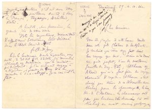 Très intéressante lettre sur les Touarges, avant son installation à l’Asekrem.{CR}« Vous êtes j’espère à cette heure rentré dans votre joli Château de Motylinski. […] Moûra m’a donné un guide parfait, d’une des meilleures familles des Dag-Râli, Elkhasen ag Akroud qui m’a fait faire un voyage charmant & rapide. Elkhasen était chargé par Moûra de se débrouiller avec Abahag pour les chameaux, les ânes, &c. de l’Asekrem. Les chameaux ont pu par bonheur être trouvés ici où Abahag en avait amené quelques-uns. On me dit que l’eau du pied même de l’Asekrem sera insuffisante. Elle est permanente, mais c’est un tout petit filet d’eau, dit-on... Il y a quantité d’eau un peu plus loin, mais encore très près, à 1 h de distance de plus il y a des Abankor dans la vallée de Taremmout (haute vallée de Tamanraset) »... Il n’a plus de purgatifs, et demande de lui fournir « de quoi purger 10 ou 12 personnes », car au printemps, « les Haratins se bourrent d’orge & blé nouveau », et il faut y remédier par des purges ou l’ipéca... Aujourd’hui, un fils et un neveu de Mohammed ag Ourzîg [chef touareg] sont venus « très gentiment » lui rendre visite : « La dislocation des Kel Ahaggar a eu lieu, chacun est rentré chez soi ; les Dag Râli ne quitteront pas l’Atakor, où il y a encore à manger 1 peu partout ; les tentes des Md ag Ourzîg resteront aussi dans l’Atakor. Celles des Moûra ont, dit-on, filé vers la Tajoûlet »... Dans ce que qu’il a traversé de l’Atakor (Idèles, Siberi, Tiliouin, Tinterin, Azekka-n-Akkar, la vallée de Tamanrasset depuis sa source, etc.), « il y a partout un peu d’acheb [sorte d’herbe], & nulle part il n’y en a une grande quantité ; des troupeaux dispersés peuvent y trouver très bien ce qui leur faut ; mais je n’ai pas vu d’endroit fournissant sur l’espace restreint de quoi bien nourrir des troupeaux massés »... Il envoie ses respects « au Docteur » et ses amitiés à tous les Français, et ajoute : « Le lendemain de notre séparation, vers midi, à 30 kil. est d’Idelès, j’ai rencontré El Kounti ag Ouri Saïd qui se rendait près du Colonel : je l’ai vivement engagé à se dépêcher, à prendre ses traces & à le rejoindre à I-n-Abeggi »...