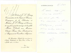 « Le dossier reçu par moi ce matin ne vient pas de ma cousine Mad. Watrigant, mais d’une autre cousine Mad. Maurice Maillot ».{CR}On joint le faire-part du mariage de la fille du colonel J.S. Rémy, Compagnon de la Libération (Oran 8 juillet 1950), avec note autogr. de De Gaulle : « Moi – ne pas confondre avec Gilbert Renault ! »