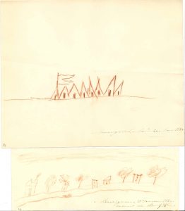 Dessins d’enfance. Les trois dessins portent des annotations de la main de l’une des deux sous-gouvernantes des enfants royaux, la comtesse Eugène de Ribera, qu’ils appelaient familièrement « Ri ».{CR}Paysage au bord d’une route avec des maisons, des arbres et un moulin à vent, annoté au recto « Monseigneur, 15 janvier 1827. Cabinet du Roi. 5 ¾ ». Ligne de montagnes pointues, annotée au recto : « Monseigneur 13 février 1827 ». Rangée de tentes militaires, la première à gauche avec un drapeau, annotée au recto « Monseigneur mars 1827 », et portant au verso la dédicace autographe au crayon bistre « A Ri ».