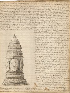 Très intéressante relation sur l’Indochine par un lieutenant de vaisseau qui commanda, entre mars 1879 et mars 1881, une canonnière faisant la surveillance des voies navigables de la Cochinchine. Le manuscrit est la mise au net d’extraits d’une « correspondance descriptive » et d’une « correspondance intime » ; il est émaillé de dessins à la plume (dont une belle série des tours, pavillons et têtes de Brahma d’Angkor Wat et Angkor Thoud).{CR}Le récit s’ouvre au départ de Toulon, le 20 janvier 1879, à bord de la Corrèze, et se conclut à Châu Dôc, dans la région du delta du Mekong ; l’auteur écrit très lisiblement et livre ses impressions et observations, ainsi que quelques aperçus de la vie des colons. On le suit en Méditerranée, dans le canal de Suez, en mer Rouge, puis d’Aden à Ceylan, à Singapour, et à Saïgon, Mytho, Gocoug, Vinh-long, Sadec, Beutré, Long-Xuyen, Cantho, Phnom Penh, Travinh, Cochien, Long-Phu, Angkor, Phnom-Baké etc. Ses quatre voyages au Cambodge donnent certaines des plus belles pages. Ainsi, à Angkor Thoud : « Tout autour, des soubassements merveilleusement ciselés, des corniches, des médaillons aussi beaux que ceux d’Angkor Wat, mais plus dégradés et tristes à voir à la lueur de nos torches. Au-dessus de nos têtes une haute voûte dans laquelle nous retrouvons le glapissement des chauves-souris et où nous voyons des fissures, des crevasses, avec un bout de ciel bleu entrevu à travers quelque racine ou quelque branche de liane éclairée par un rayon de soleil. Nous marchons, nous marchons toujours, à tâtons, avec mille précautions, baissant les torches pour voir la saillie des blocs, emboitant le pas les uns derrière les autres, ne soufflant mot et nous arrivons à l’autre extrémité de cette galerie qui dut être jadis d’une grande splendeur. [...] dans un dernier effort, nous mettons le pied sur une vaste plateforme relativement dégagée d’arbres et de lianes, parfaitement plane, où le soleil se joue et où nous attend le spectacle le plus extraordinaire, le plus inouï, le plus imprévu, le plus splendide, le plus étrange qu’il soit possible d’imaginer. [...] De la plateforme s’élancent des tours, les unes grandes, les autres petites, assez semblables les unes aux autres portant chacune, en camée, et regardant les quatre points cardinaux, de grandes figures sculptées de trois à quatre mètres de hauteur. Ce sont des têtes de Brahma, au grand regard mystérieux, enchâssées dans la tour comme des pierres précieuses dans une pièce d’orfèvrerie qui constituent quelque chose de fantastique, comme un décor de féerie, quelque chose de rêvé dans une hallucination mais impropre à la réalité, impossible et réel »...{CR}On joint un album de plus de 100 photographies prises par lui au Siam et au Cambodge (palais, pagodes, grottes, transports fluviaux, indigènes et Français…), plus qqs coupures de presse.