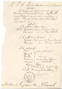 Copies certifiées conformes de décisions du préfet maritime, et d’une lettre au préfet, pour le capitaine du Chacal ou du Léopard, concernant la mise en subsistance d’ingénieurs et ouvriers de l’usine Belleville et des essais mécaniques. Demande d’autorisation à appareiller pour le Chacal.{CR}On joint 27 P.S. par d’autres officiers de la Marine, Toulon 1869.