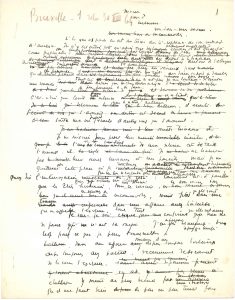 Brouillon d’une conférence sur Freud et l’éthique de la psychanalyse, première des deux conférences données par Lacan à la Faculté universitaire Saint-Louis à Bruxelles, les 9 et 10 mars 1960.{CR}Le manuscrit, à l’encre noire sur papier filigrané Mousmé Paper, est abondamment raturé et corrigé, et présente d’importantes variantes avec le texte publié en 1986 dans Psychoanalyse, revue de l’École Belge de Psychanalyse (n° 4), plus développé ; la dernière page, au stylo bille rouge, semble avoir été ajoutée ultérieurement ; en tête, Lacan a noté : « Bruxelles-1 relu 30 VIII 64 ».{CR}« L’h[omme] qui vous parle en est au terme du 4e septenn[aire] de son introd[uction] d’analyse. […] Toute ma vie devint écoute d’autres vies qui s’avouent. Je ne suis rien pour peser leur mérite, et l’une des fins de mon silence est de taire l’amour »... Lorsqu’il accompagne « l’élan d’un de mes patient vers un peu de réel », il dérape « sur ce que j’appellerai le credo de bêtises dont on ne sait si la psychologie contemporaine est le modèle ou la caricature : à savoir le moi tenu pour fonction de synthèse à la fois d’intégration […] la conscience comme achèvement de la vie et l’évolution comme voie de l’avènement de l’univers à la conscience », qui mène à « une impuissance toujours plus grande de l’homme à rejoindre son propre désir »… C’est ce que Freud a subitement éclairé « au niveau de la névrose », en mettant en évidence la complexité du désir. « La caractéristique propre à l’inconscient freudien est d’être traduisible […] Ce qui se traduit c’est ce qu’on appelle le signifiant », des éléments formant une chaîne signifiante, dont Lacan donne des exemples. Puis il se livre à des variations sur les rapports entre désir, discours, poésie, mensonge… « Le désir inconscient c’est ce que veut celui qui tient le discours inconscient, c’est ce pour quoi il parle, c’est dire qu’il n’est pas forcé tout inconscient qu’il soit de dire la vérité, bien plus le fait même qu’il parle y rend possible le mensonge »… Plus loin, bien que ne professant pas « le Credo qui règne en ces lieux », Lacan va commenter un extrait d’une épître de Saint Paul, car « une épître de St Paul me paraît aussi importante à commenter en morale qu’une de Sénèque »… Et il ajoute malicieusement : « je ne suis pas pour me plaindre que des ecclésiastiques renvoient leurs ouailles à la psychanalyse. Ils font certes fort bien »… Lacan se demande pourquoi Freud, pourtant « franc matérialiste », n’a pas su résoudre le problème de « l’instance morale » par « des recours utilitaristes », alors qu’il avait bien établi que la morale « consiste primordialement dans la frustration d’une jouissance posée en loi apparemment gratuite »… Il y voit le poids d’une certaine hérédité, et de la figure du Père… Mais il ne s’agit pas de « faire la psychologie de Freud », qui lui apparaît « évidemment féminine par l’exigence monogamique – qui le soumet à une dépendance uxorieuse », et « très peu père », et qui « n’a vécu le drame œdipien que sur le plan de la horde analytique et pour une mère qui était la Mère-intelligence – et ce que nous avons appelé la Chose freudienne, qui fut d’abord la Chose de Freud à savoir (une poupée qui parle toute seule) le désir inconscient. L’important est la découverte de la chose et il la suit chez ses patients »… Lacan s’interroge sur l’intérêt de Freud pour le monothéisme, où il retrouve « la valeur sublimatoire de la fonction du Père »… En conclusion, Lacan voit l’homme surdéterminé par le Logos, qui « articule en lui le manque de l’être et conditionne sa vie comme passion et sacrifice ». La réflexion de Freud n’est ni « humaniste », ni « progressiste », mais « démarquante ». Loin de la « religiosité » de Jung, Freud a placé la culpabilité « au niveau de l’inconscient »…