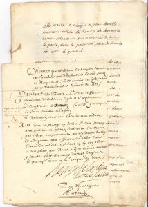« Chemin que tiendront les troupes tant de Cavalerie que d’Infanterie levées soubz le nom de M. le Marquis de Poyanne pour venir joindre larmée du Roy » : Tartas, Saint-Sever, Cazères, Castets et Maupas, Cugeron… Il leur sera fourni des vivres aux étapes, et les officiers devront « faire vivre leurs cavaliers et soldats en sy bon ordre et discipline que nous n’en recevions aucune plainte »…{CR}On joint un très intéressant manuscrit : « Mémoire sur ce qui a fait lestablissement solide de Henry de Lorraine comte d’Harcourt, surnommé Le Cadet la perle, dont la postérité fait la branche de Mr le Grand » (17 pages in-fol.).