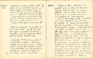 Journal de voyage, avec son ami Mariéton, en bateau, train et voiture, avec étapes ou séjours à Monaco, San Remo, Gênes, Pise, Assise, Spello, Foligno, Spoletto, Rocco di Corno, Vigliano, l’Aquila, Sulmona, Naples et Rome, et retour à Nice. Notes sur les monuments, paysages, curiosités et « péripéties » de son voyage, avec une attention particulière aux qualités et défauts du chemin de fer italien. Témoignage curieux reflétant la séparation imminente des églises et de l’État en France : « Visite au père Pic, capucin homme important – mouche de la Congrégation. Sur mon interrogation expresse, après une forte hésitation, il me dit : “Eh bien, je considère et ne doute pas que la France est perdue. Non seulement c’est J.-C. mais Dieu lui-même, l’idée de Divinité, l’idée d’ordre et de moralité supérieure qu’elle est en train de chasser. Mery del Val n’a aucune espèce d’influence sur le pape, et c’est pour cela, à cause de son âge, qu’il a été choisi. Le Pape a déclaré qu’il serait lui-même son propre secrétaire d’État. Le Pape est un homme étonnant, tout à fait fin, intelligent, et qui réserve des surprises au monde” »... Quelques croquis et plans topographiques, et des comptes aux derniers feuillets…