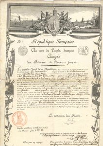 Beau congé accordant à la goëlette Les Deux Amis, domiciliée à Bordeaux, l’autorisation « de naviguer sous le pavillon national de France », et, sous les ordres du capitaine de Larieux, de « partir du Port et Havre de Bordeaux et aller à la Martinique chargée de vins »… Le congé a été visé par les bureaux de la Douane du Port de Bordeaux.