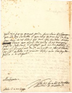 Guerre de Hollande. « Voyant que quelque diligance qu’on puisse faire aux navires de M. d’Almeras et le mien ils ne scauroient estre prest qua la fin de ce mois je fais travailler nuit & jour aux cinq autres pour sembarquer leurs vivres & leur […] qui seront prest a la fin de cette semaine. Si M. le Comte de Vivonne acepte la proposition que je viens de luy savoir faire de joindre les galleres que le Roy fait armer presantement a ses cinq vaisseaux pour aller combattre les vaisseaux hollandois qui sont a la rade de Liorne dont la lettre du Roy me donne avis et qui se confirme par ces dernieres nouvelles qu’on en a je manbarque sur un des di vaisseaux pour cette expedition »…
