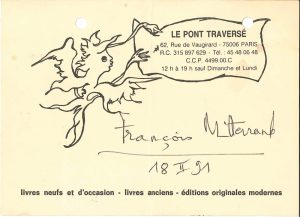 Carte de la librairie Le Pont traversé, que Mitterrand aimait visiter, signée et datée : « François Mitterrand 18 II 91 ».