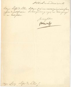 Il prévient Jean-Baptiste Legendre de Luçay (1754-1836), qu’il a nommé Préfet du Palais un an plus tôt : « Citoyen Préfet du Palais, Le Citoyen Locrè vous remettra quinze mille francs, en forme de gratification. Je désire que vous y voyez un témoignage de ma satisfaction »…{CR}On joint la L.A.S. de réponse de Luçay au Premier Consul, le remerciant de « ce nouveau témoignage de bonté » ; un billet autogr. à l’architecte Chalgrin ; 3 lettres adressées à Luçay (1800-1802) par le Consul Lebrun, Melchior Bezave-Mazières (racontant la réception des envoyés du Cher par le Premier Consul et la fête du 1er vendémiaire) et le Sénateur Porcher (le félicitant de sa nomination de Préfet du Palais) ; le Décret Impérial le nommant pour « présider le collège électoral de département du département du Cher » en octobre 1806 (brevet signé par Cambacérès et Champagny, 14 mai 1806) ; un imprimé, Réglement du Théâtre de la République et des Arts du 19 ventôse IX (avec qqs annotations en marge) avec un manuscrit, Projet arrêté sur l’administration du Théâtre des Arts, formant complément et rectification des Arrêtés et Reglemens sur cette matière (3 p. in-fol.).
