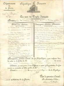 Brevet de lieutenant à la 24e demi-brigade légère pour le citoyen Claude Noirot, avec le détail de ses services, campagnes et actions à la Martinique, aux armées du Nord, des Côtes de l’Océan, de Sambre-et-Meuse, de l’Ouest, d’Angleterre, d’Italie. « A fait partie de l’expédition d’Irlande commandée par le Gal Hoche », etc. On joint 2 documents sur les états de services de Noirot, 1799-1810.