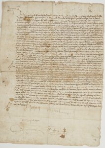 Beau et très rare document réunissant les deux signatures des arrière-grands-parents d’Henri IV, souverains du royaume de Navarre. [Catherine de Foix était héritière du royaume de Navarre par son frère François Phébus (1467-1483) ; sa mère, Madeleine de France, assura jusqu’en 1494, date de ce document, la régence du royaume, dont la capitale était alors Pamplona ; en 1512, Ferdinand le Catholique s’emparera de la partie « espagnole » de la Navarre pour la réunir à la Castille et l’Aragon.]{CR}« Don Johan », par la grâce de Dieu Roi de Navarre, duc de Nemours, de Gandia, de Montblanch et de Penyafiel, comte de Foix, seigneur de Béarn, comte de Bigorre, de Ribagorça, de Pontiebre, de Peyregorch (Périgord), vicomte de Limoges, Pair de France, et seigneur de la cité de Balaguer, et « Doña Catheline », Reine propriétaire dudit Royaume, duchesse, comtesse et dame desdits duchés, comtés et seigneuries, voulant exalter la puissance, la libéralité et la magnificence des Rois en prodiguant des grâces et honneurs à ceux qui les ont fidèlement servis, veulent ici récompenser les bons services de leur conseiller Don Alonso de Peralta, comte de San Estevan (Saint-Sébastien) et seigneur de Peralta et de Maya, en confirmant le droit et titre qu’il tient comme héritier et successeur du connétable don Pedro de Peralta de la ville et du château d’Andosilla, en vertu d’un échange fait avec le Roi Don Carlos [Charles III de Navarre], et lui font don de tous les droits seigneuriaux, privilèges et revenus divers sur la ville d’Andosilla, pour lui et ses successeurs, sauf la Haute Justice que le Roi et la Reine se réservent…{CR}Vente Huit siècles de l’histoire de l’Europe (27 novembre 2008, n° 37).