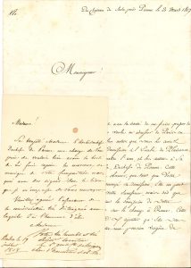 Château de Sala près Parme 21 mars 1817, à l’ancien évêque de Plaisance, Étienne-André-François de Paule Fallot de Beaumont de Beaupré : il a reçu du baron de Vincent la lettre et les notes de Son Excellence, relatives à sa démission de l’évêché de Plaisance, et les a soumises à S.M. l’Archiduchesse, duchesse de Parme : « Cette Souveraine, m’a ordonné de vous observer, que tant que Votre Excellence ne Lui aura point envoyé sa démission, Elle ne peut point proposer à Sa Sainteté votre successeur », mais elle garantit une pension viagère de 12 000 francs et fera veiller au mobilier laissé dans le palais... Baden 19 juillet 1818, à une dame : « Sa Majesté Madame l’Archiduchesse Duchesse de Parme me charge de vous prier de vouloir bien avoir la bonté de lui faire copier les morceaux de musique de votre composition marqués avec des signes dans le livre que je m’empresse de vous renvoyer »...