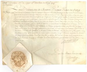 Louis, duc d’ORLÉANS, dit le Génovéfain (1703-1752) fils du Régent, il fut gouverneur du Dauphiné, colonel général de l’infanterie et chef du Conseil d’État. P.S., contresignée par son secrétaire Nicolas-Hubert de Montgault...