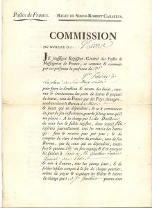 Commission pour la veuve Pradier, à la place de son mari décédé, « pour faire la direction & recette des droits, revenus & émoluments des ports de lettres & paquets [...] tombant dans le Bureau de Nions », signée par le régisseur-général des Postes Simon-Robert Carabeux, et visée par l’intendant-général Rigoley d’Ogny.{CR}On joint une P.S. par le Président Albert Lebrun, contresignée par Édouard Daladier, Paris 7 février 1940 (1 page grand in-fol. en partie impr., cachet sec) : exequatur pour James Kenneth Victor Dible consul de Sa Majesté Britannique à Bordeaux.