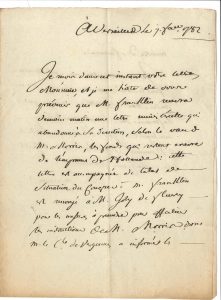 Lettre relative à la jeune République américaine, évoquant son ministre plénipotentiaire à Versailles, Benjamin Franklin, son surintendant des Finances, Robert Morris, ainsi que l’homologue français de ce dernier, Jean-François Joly de Fleury, et le ministre des Affaires étrangères, le comte de Vergennes. « M. Franklin recevra demain matin une lettre ministérielle qui abandonne à sa direction, selon le vœu de M. Morris, les fonds qui restent encore de l’emprunt de Hollande : cette lettre est accompagnée de l’état de la situation du Congrès. M. Franklin est renvoyé à M. Joly de Fleury pour les mesures à prendre pour afficher les instructions de M. Morris dont M. le Cte de Vergennes a informé le ministre des finances »...