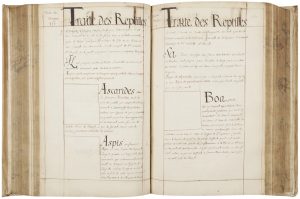 Curieux recueil calligraphié aux encres brune et rouge, qui appartint à Jean-Baptiste Huzard (1755-1838), inspecteur général des écoles vétérinaires, membre de l’Académie des Sciences et de l’Académie de Médecine.{CR}Refonte d’un Traité des drogues plus ancien, le manuscrit comprend 9 traités. Chaque traité est suivi d’une table des matières sur deux colonnes, « noms latins », « noms françois » ; les chiffres en marge des noms latins renvoient au Traité des drogues de référence, ceux en marge des noms français correspondent à la pagination du présent manuscrit. De fréquents renvois au « Traité des Drogues » figurent tout au long du manuscrit, ainsi que des encadrements, restés vides, témoignant d’illustrations prévues mais non réalisées.{CR}Traité des Animaux (p. 1-145), d’Agnus (Agneau) à Zibelum (Sivette) ; Traité des Oiseaux (p. 153-280), d’Accipiter (Épervier) à Vultur (Vautour) ; Traité des Poissons (p. 299-449), d’Acarnan à Xiphias ; Traité des Incectes (p. 490-513), d’Araneus (Aragne ou Aragnée) à Uva marina (Raisin de mer) ; Traité des Reptilles (p. 558-583), d’Amphisbæna (Espèce de Serpent) à Vipera (Vipère) ; Traité des Méteaux (p. 586-633), d’Argentum (Argent) à Hidragirus (Mercure, ou vif argent) ; Traité des Minereaux (p. 635-674), d’Alumen (Alumen) à Zinch (Espèce de Marcaliste) ; Traité des Pierres et Terres (p. 677-793), d’Achates (Agate) à Sory ; Traité des Drogues (p. 798-1099), d’Acetum (Vinaigre) à Zopissa.{CR}Animaux, oiseaux, poissons, insectes, reptiles, métaux, minéraux, pierres, terres et drogues, classés par ordre alphabétique de leur nom latin, sont décrits et étudiés en vue de leur intérêt thérapeutique pour l’homme et l’enfant ; leurs vertus sexuelles, cependant, sont souvent remplacées par des points de suspension. Citons quelques extraits. Aper, en français Sanglier. « Les dents du sanglier sont employées a faire des hochets qu’on donne aux enfans a macher afin d’exciter leurs premieres dents a sortir, on aporte des Indes des dents de sanglier bien plus longues et plus grosses que celles de France. Les dents estant broyées en poudre très subtile sont alklines, sudorifiques, aperitives, propres pour la pleuresie pour adoucir les humeurs trop acres du corps, pour arrester le crachement de sang : la dose est un scrupule. La graisse du sanglier est propre pour ramolir, pour resoudre, pour fortifier pour adoucir les douleurs : on en frotte les parties malades. Son fiel est propre pour resoudre les tumeurs scrofuleuses »... Cornix, en français Corneille. « Les corneilles et leurs petits qu’on appelle Corniculæ contiennent beaucoup de sel volatile et d’huile. Elles sont propres pour reparer les forces abatues, pour fortifier le cerveau, on en mange ou bien l’on en fait des boüilons. L’excrement de la corneille est bon pour la dissenterie, pris dans du vin »... Mytilus, [en français Moule]. « Il est propre contre la morsure du chien enragé, il est fort aperitif, il excite lurine et les ...... aux femmes »... Adamas, en français Diamant. « Pour ce qui regarde lusage du diament dans la medecinne, tout diament fin pour raison de sa solidité qui resiste au feu et au coups de marteau, et qui ne permet pas qu’on le puisse employer en la composition daucun medicament est de nul usage. Il y en a neamoins qui tiennent quil se peut rompre par le moyen du sang de Bouc tout chaud et tout recent, et particulierement sy le Bouc a bû du vin auparavant, et sil a mangé du persil, ou du sesely de montagne »...{CR}Ancienne collection de Jean-Baptiste Huzard, avec son cachet-griffe Huzard de l’Institut au premier feuillet.