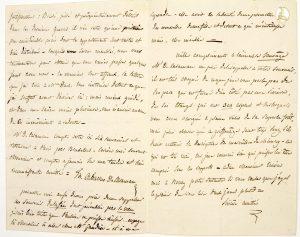Belle lettre écrite quelques semaines après son mariage avec le prince de Chimay.{CR}Elle remercie son correspondant pour ses lettres et pour son intérêt pour ses affaires : « Quelque soit l’issue de mon malheureux procès, je n’oublierai jamais, que votre amitié n’a rien négligé pour qu’elle soit favorable et mon cœur en conservera un reconnaissant souvenir »... Les fêtes se succèdent depuis son arrivée à Chimay : « On m’a fait ici la plus brillante réception et la plus imprévue, car Mr de Caraman [son époux] n’étoit arrivé à Chimay que deux heures avant moi. Elle a été telle qu’on l’auroit faite il y a trente ans »… La veille elle a baptisé un enfant « avec la pompe usitée, toutes les cloches sonnoient » ; le soir la musique militaire lui a donné une sérénade et on a fait un feu d’artifice… Elle décrit le château de Chimay, « bati sur des rochers très escarpés et au milieu des ruines des anciennes fortifications ; brulé, pillé et presqu’entièrement détruit dans les dernieres guerres, il n’en reste qu’une partie peu considérable, mais dont les appartements sont vastes et bien distribués. […] Les chemins sont affreux »… Son époux compte y séjourner six semaines avant de retourner à Paris par Bruxelles… Elle ajoute un post-scriptum, car M. de Caraman est « choqué de ce que je ne vous parle pas de son parc qui est fermé d’un côté par une riviere, de ses etangs qui ont 300 arpens et sur lesquels nous avons navigué à pleines voiles, de sa superbe forêt »…