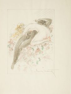 Un des 50 exemplaires sur vélin d’Arches, celui-ci étant l’un des 20 premiers comprenant un cuivre, le dessin original correspondant, une suite de toutes les illustrations en premier état tirée en noir avec remarque et une suite en deuxième état sans remarque tirée en sépia.
