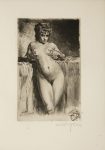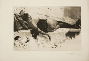 Édition originale tirée à 250 exemplaires, de cet ouvrage « où sont réunies quarante visions de la femme contemporaine étudiée dans le rôle et les attitudes de l’amour ». Elle est illustrée de 41 eaux-fortes originales, dont une sur la couverture et 40 hors texte sous serpentes légendées en rouge, dessinées et gravées par ALMÉRY LOBEL-RICHE (1877-1950).