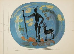 Comprend une photo de Picasso en frontispice et 18 reproductions de céramiques de l’artiste, de forme ovale, montées sur feuillets de vélin illustrés de motifs dessinés par Picasso.{-}Petites taches et ac-ocs au 1er plat.