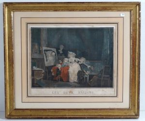DEBUCOURT, Les deux baisers, eau-forte en couleurs (Piqûres) XIXe