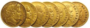ENSEMBLE de 7 MONNAIES de 10 FRANCS OR dont 10 FRANCS Cérès 1851 A Paris, 10 FRANCS Napoléon III tête nue 1857 (3 ex.), 1859 BB Strasbourg. Tête laurée 1862 A Paris et 1866 A Paris. G. 1012, 1014 et 1015.