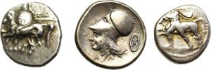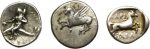 LOT de 3 MONNAIES grecques argent comprenant : Statère de Tarente (1 ex.), Statère de Corinthe (1ex.), Drachme de Larissa (1 ex.).