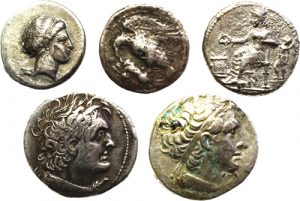 LOT de 5 MONNAIES grecques argent comprenant 2 didrachmes, 1 statère et 2 tétradrachmes.