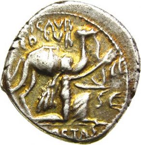 Le roi Arétas agenouillé tenant la bride de son chameau.